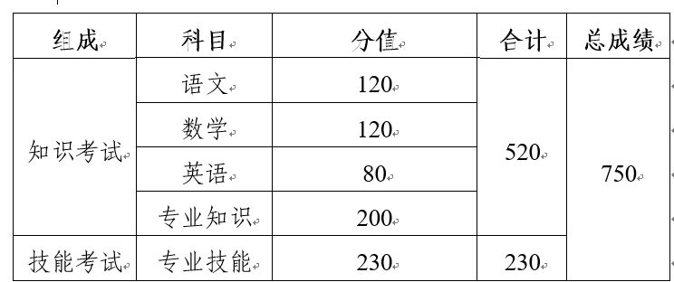 答:春季高考统一考试包括“知识”和“技能”两部分,考试科目和分值如下表: